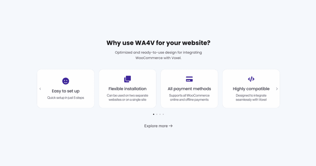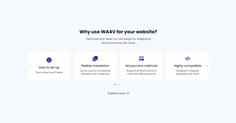 Supports WooCommerce payments for Voxel websites, offering flexible integration for both single-site and dual-site setups. Fully compatible with all Voxel payment transactions