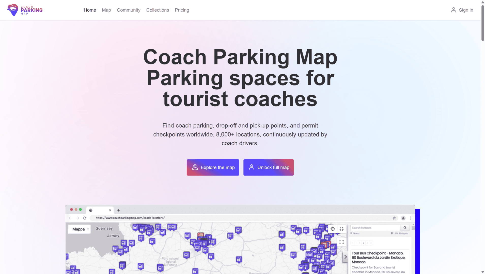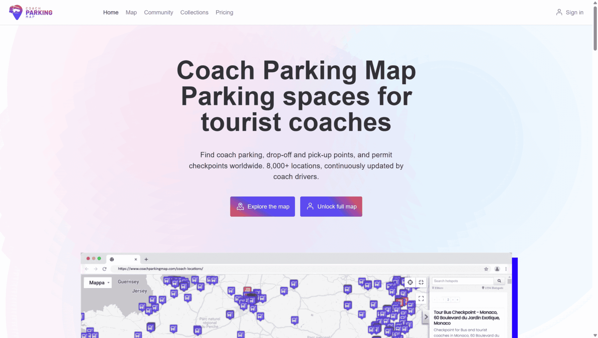 Coach parking, drop-off and pick-up points, and permit checkpoints worldwide. 8,000+ locations, continuously updated by coach drivers.