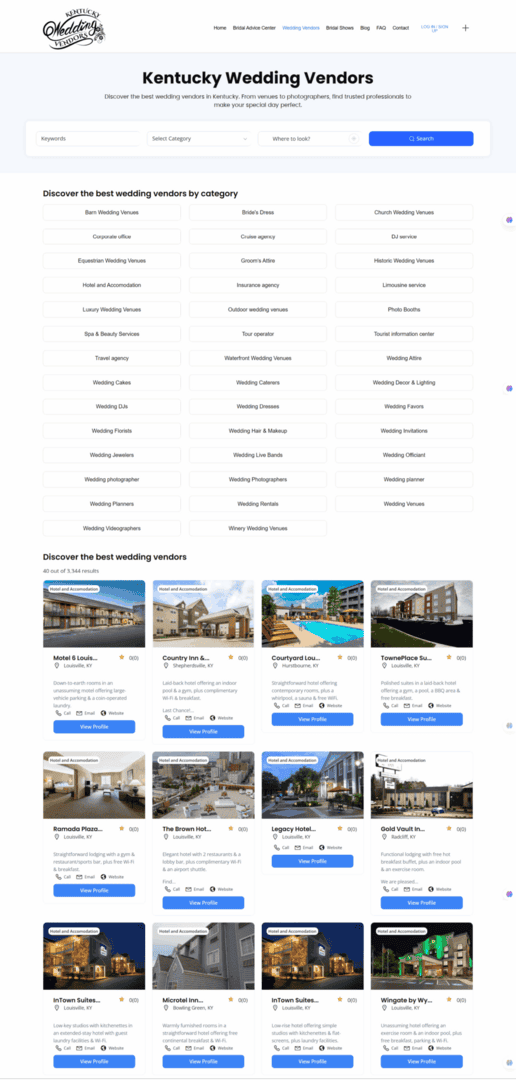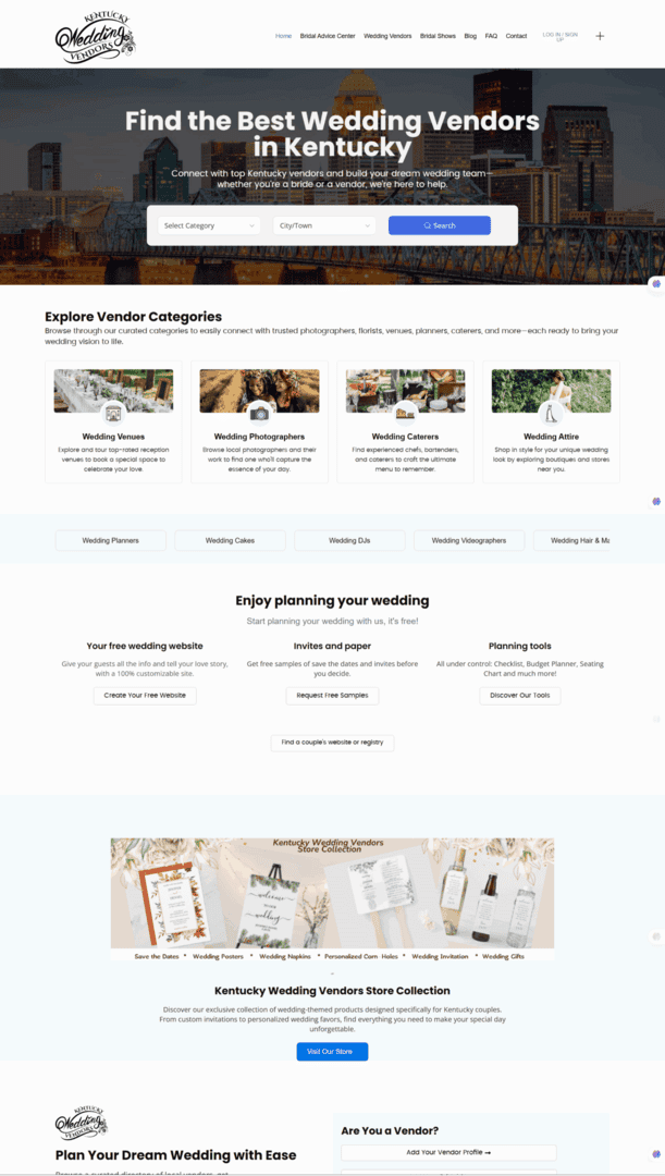 Weddings are big business, and Kentucky needed a go-to hub for vendors. This statewide directory makes it effortless for couples to find top-tier florists, venues, photographers, and more—all in one place. We built a sleek, high-performance site that’s easy to navigate, SEO-optimized, and primed for growth. With a rock-solid directory system and strategic design, this site isn’t just a list—it’s a wedding planning powerhouse.